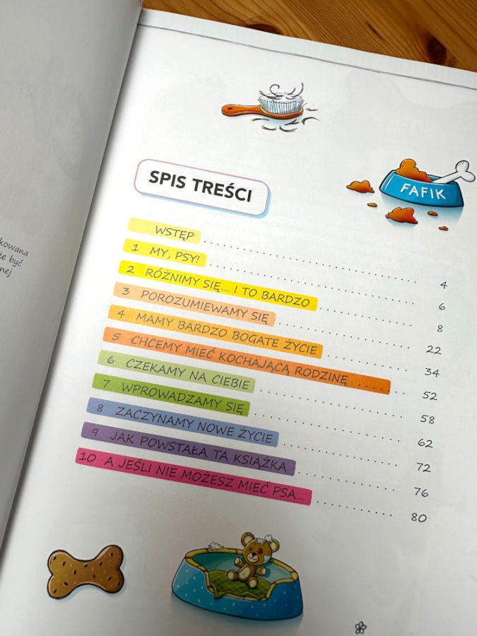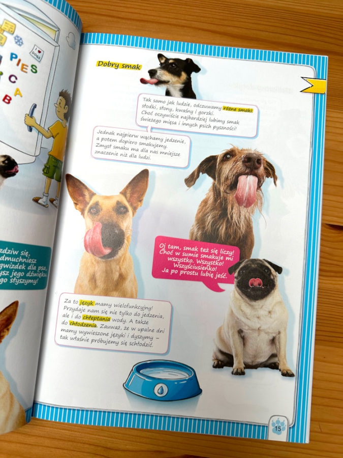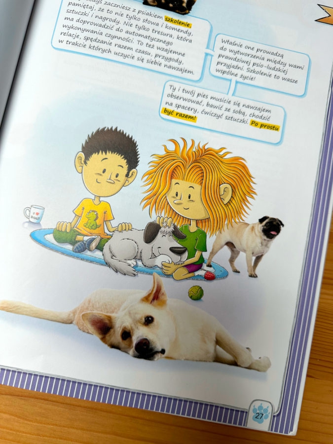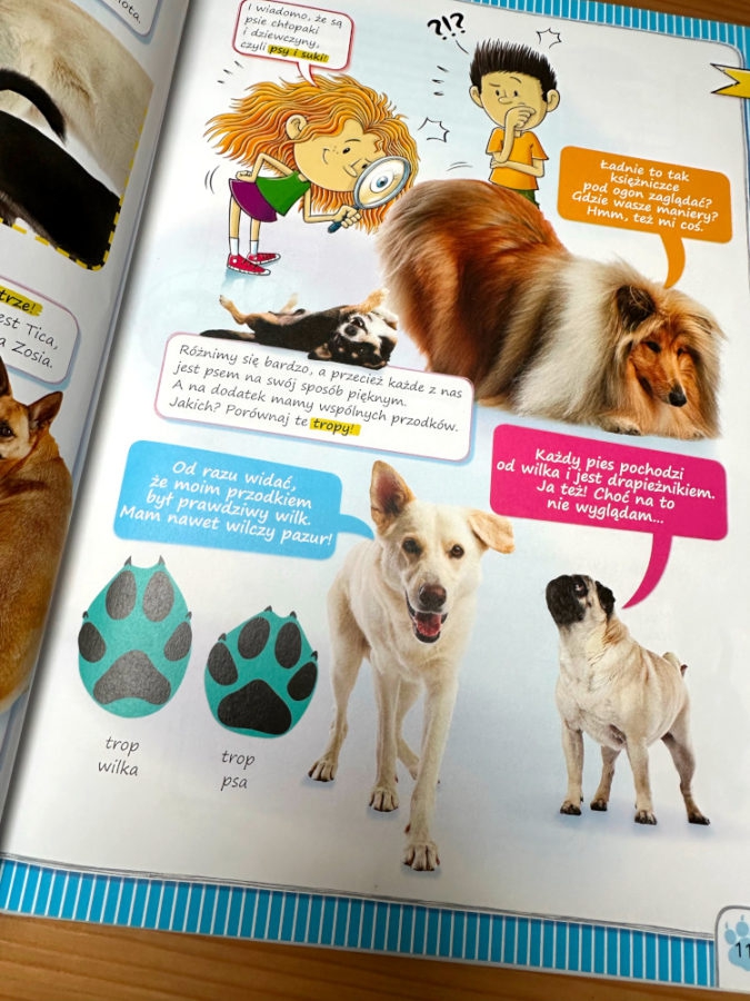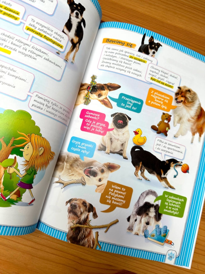 W książce w towarzystwie graficznych ilustracji wykorzystano prawdziwie psie fotografie. Uśmiechnięte psie mordki mówią do dzieci z każdej strony.