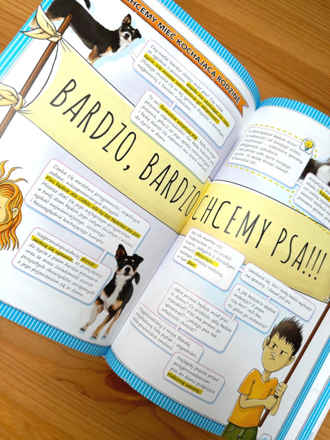 Bardzo, Bardzo chcemy Psa!!! Taki pojawia się w książce transparent niesiony przez dzieci. Plakat o podobnej treści przygotował mój Jaś, zanim wzięliśmy książkę do rąk. W tej części książki autorka podpowiada jak podzielić obowiązki względem psa tak, aby każdy członek rodziny czuł się zaangażowany. Kto da jeść, kto wyprowadzi na spacer o różnych porach dnia. Można skorzystać z podpowiedzi jak przygotować tabelę z rozpisanymi zadaniami. Zwierze, które pojawi się w domu, obdarzy nas dużą porcją zaufania, której nie wolno nam zawieść.